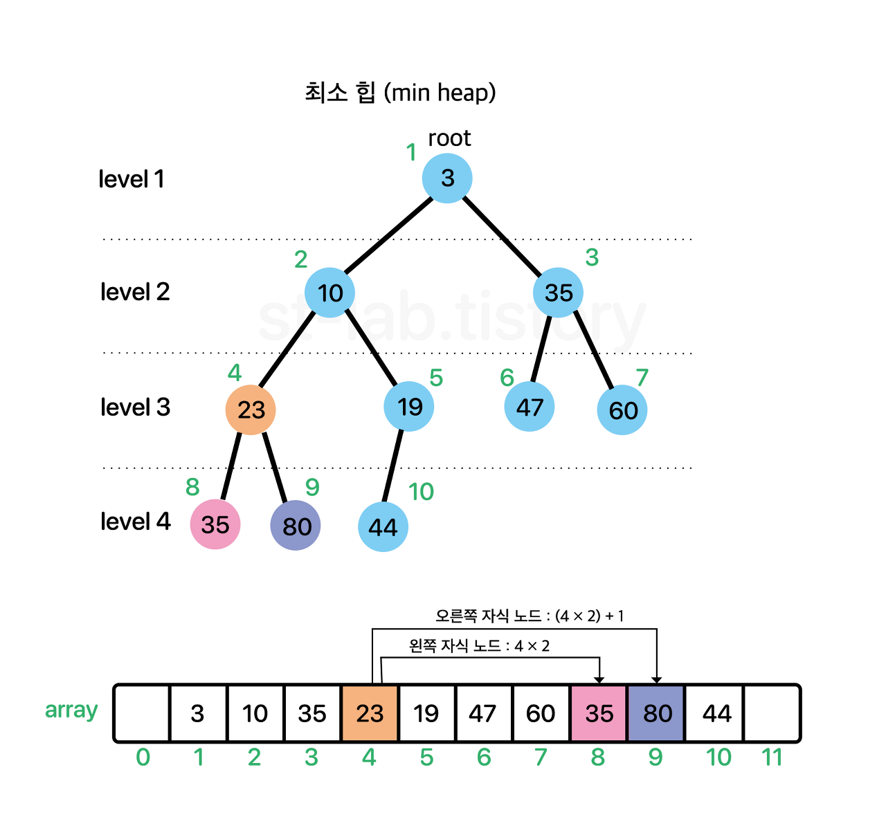 • 최소 힙 - 부모 노드가 반드시 자식 노드보다 작아야 한다.