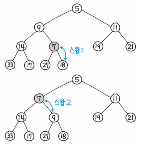 heap.set(min_pos, tmp); // 값이 큰 부모 노드를 자식노드로 변경