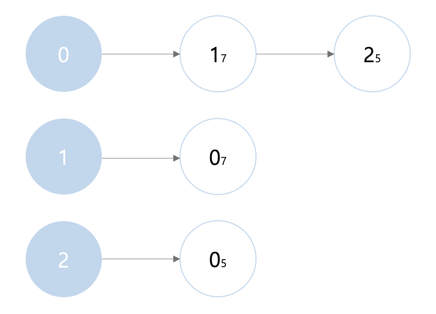 하지만 리스트 방식을 이용한다면 엣지가 있는, 즉 노드 간에 연결이 된 부분만 표기를 해주면 되기 때문에 불필요한 데이터의 저장을 막을 수 있다.