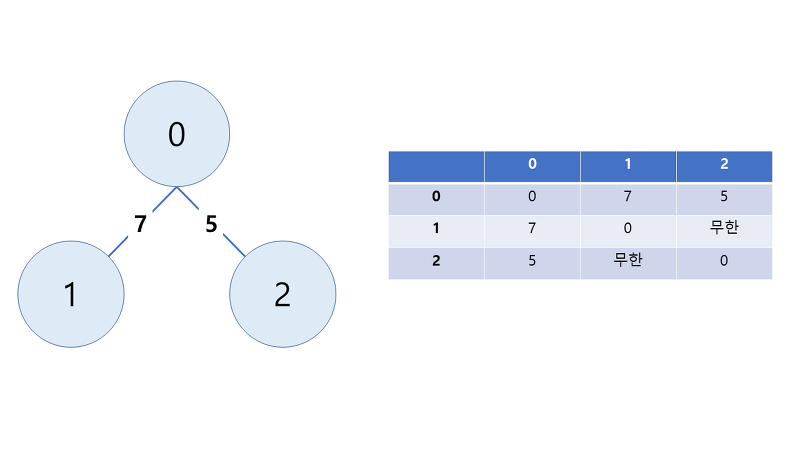 각 노드를 축에놓고 노드 간의 거리를 표에 값으로 표시한다.