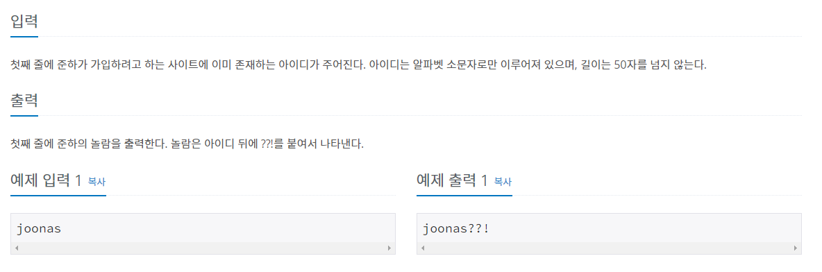준하는 사이트에 회원가입을 하다가 joonas라는 아이디가 이미 존재하는 것을 보고 놀랐다. 준하는 놀람을 ??!로 표현한다. 준하가 가입하려고 하는 사이트에 이미 존재하는 아이디가 주어졌을 때