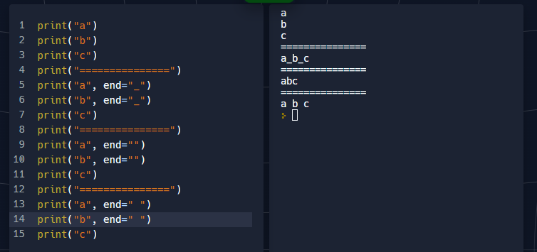 즉 이는 end의 값을 별개로 설정해주면 개행이 아닌 다른 값으로 설정할 수 있다는 뜻이다.